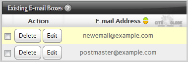 Once your e-mail account is created, it will appear under the "Existing E-mail Boxes" tab.