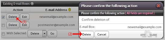 4. Under the "Existing E-mail Boxes" tab , select the appropriate E-mail address you wish to remove and then click on the "Delete" button.