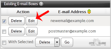 4. Under "Existing E-mail Boxes" tab, Select the appropriate e-mail address and click on the "edit" button.