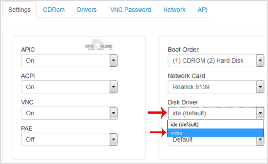 You can change the Disk Driver to Virtio or IDE before installing the operating system but should you change this after installing the OS, it will show an error that the disk is not found or a similar error. Only change this before Installing/Reinstalling the OS.